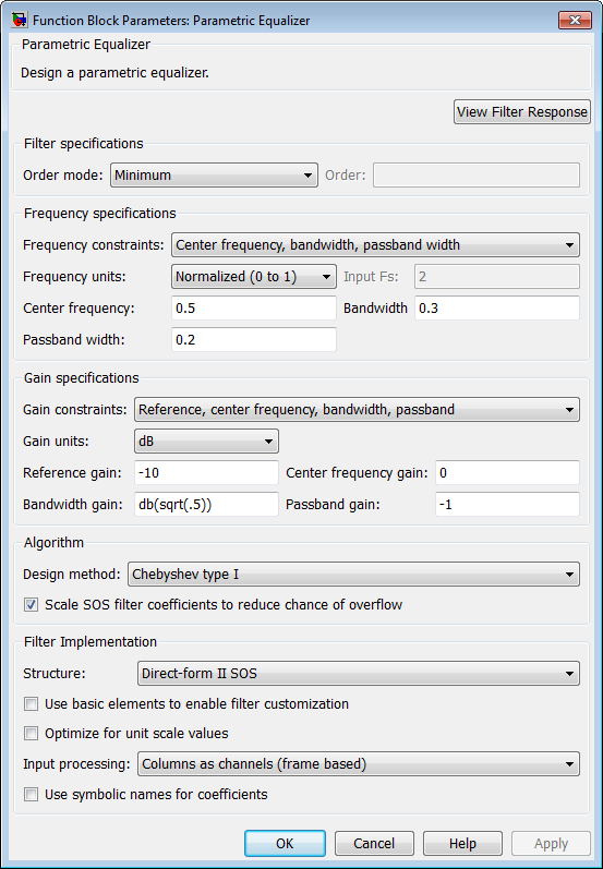 See Parametric Equalizer Filter Design — Main Pane for more information about the parameters of this block. The Data Types and Code Generation panes are not available for blocks in the DSP System Toolbox™ Filter Designs library.