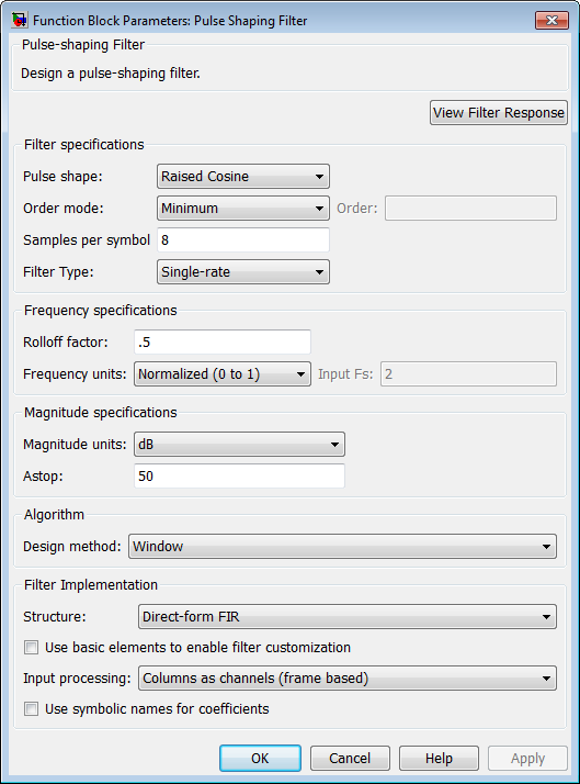 See Pulse-shaping Filter Design —Main Pane for more information about the parameters of this block. The Data Types and Code panes are not available for blocks in the DSP System Toolbox Filter Designs library.