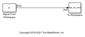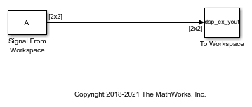 The Signal From Workspace block imports the signal from the variable A, which is a 2-by-2-by-3 array. When you simulate the model, each of the three pages (a 2-by-2 matrix) is output in sequence with period Ts. The third page is a matrix of zeros because the Form output after final data value by parameter is set to Setting to zero in this model. The To Workspace block writes the sequence of these matrices to the MATLAB workspace in the variable dsp_ex_yout.