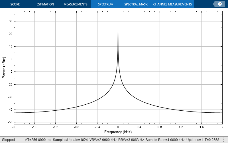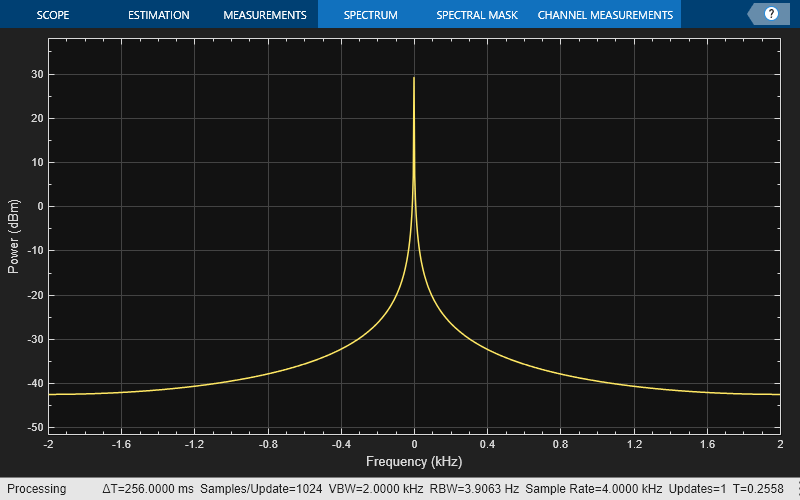 Methodto"welch".FrequencyResolutionMethodto"rbw".RBWSourceto"auto".WindowInvariantSamplesPerUpdatetotrue.