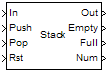 The block pushes the input at the In port to the top of the stack when it receives a trigger event at the Push port. When it receives a trigger event at the Pop port, the block pops the top element off the stack and holds the Out port at that value. The last input that the block pushes on the stack is always the first to be popped off.