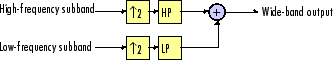 The block upsamples the high- and low-frequency subbands by 2, and then filters the results with a pair of highpass and lowpass FIR filters, as shown in this figure.