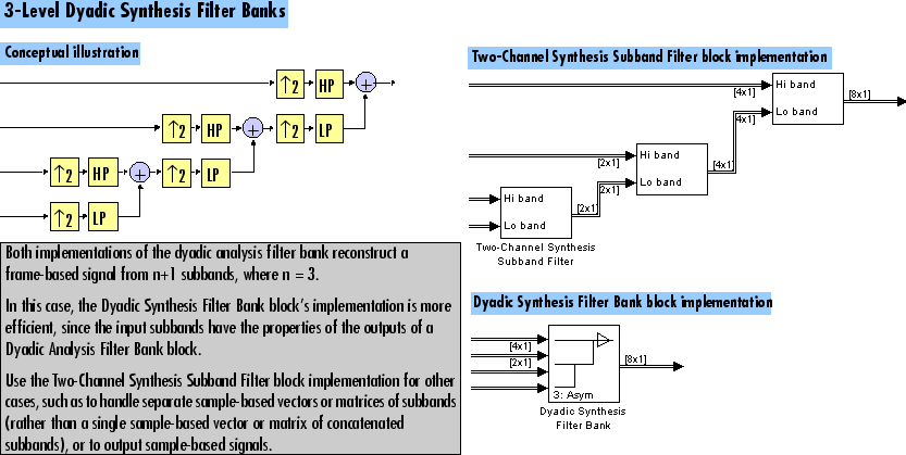 The Dyadic Synthesis Filter Bank block allows you to specify the filter bank filters by providing vectors of filter coefficients, just as this block does. The Dyadic Synthesis Filter Bank block provides an additional option of using wavelet-based filters that the block designs by using a wavelet you specify.