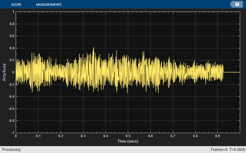 eta = 0.5 * sin(2*pi*1000/Fs*(0:396899)' + 10*sin(2*pi/Fs*(0:396899)')); signalSource = dsp.SignalSource(eta,... 'SamplesPerFrame',audioReader.SamplesPerFrame,... 'SignalEndAction','Cyclic repetition'); release(audioReader); release(timeScope); release(audioWriter); while ~isDone(audioReader) x = audioReader() / 2; s = x + signalSource(); timeScope(s); audioWriter(s); end
