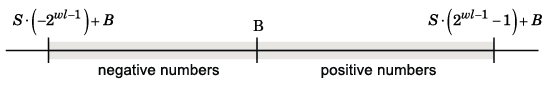 The range is the span of numbers that a fixed-point data type and scaling can represent. The range of representable numbers for a two's complement fixed-point number of word length wl, scaling S, and bias B is illustrated below: