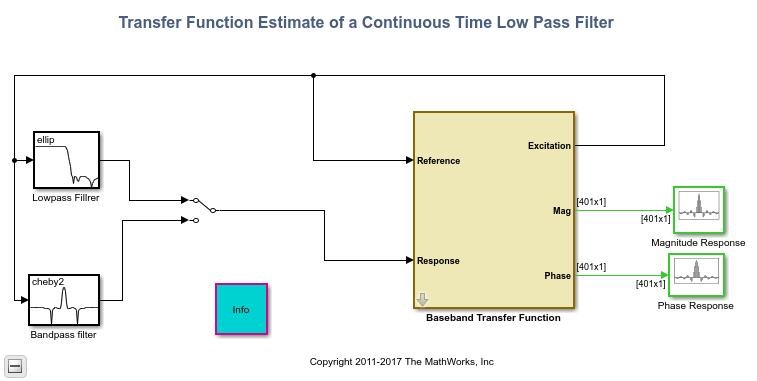This example shows how to use the Discrete Transfer Function Estimator block to estimate the magnitude and phase response of a continuous-time analog filter.