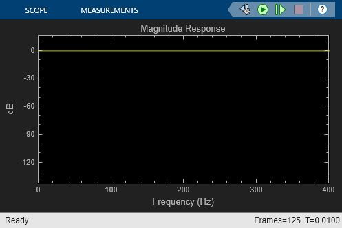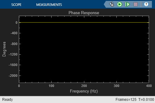 The excitation input is a random signal with uniform distribution. We feed the excitation through the filters under test. We pass both excitation and filtered signals through anti-alias analog filters with bandwidth BW Hz, and then we then transform them to discrete-time signals using Zero-Order Hold blocks with a sampling frequency of 2.56*BW Hz. The discrete excitation and output signals are fed to the Discrete Transfer Estimator block. The phase response is computed using a Phase Extractor block. We use array plot scopes to visualize the estimated filter magnitude and phase response.