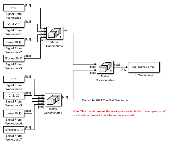 In all the Signal From Workspace blocks in the model, the Sample time and the Samples per frame parameters are set to 1. The blocks output signals of size 1-by-1. The first two Matrix Concatenate blocks concatenate four 1-by-1 signals in the first dimension and output a 4-by-1 signal. The third Matrix Concatenate block concatenates the two 4-by-1 signals in the second dimension and outputs a signal of size 4-by-2.