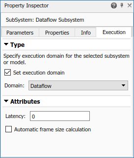 In Simulink, you specify dataflow as the execution domain for a subsystem by setting the Domain parameter to Dataflow using Property Inspector. To access Property Inspector, in the Simulink Toolstrip, on the Modeling tab, in the Design gallery select Property Inspector or on the Simulation tab, Prepare gallery, select Property Inspector. In the Property Inspector, you can set the Domain to Dataflow by selecting Set domain specification and then choosing Dataflow for Domain setting. You can also use Dataflow Subsystem block from the Dataflow library of DSP System toolbox to get a subsystem that is preconfigured with the dataflow execution domain.
