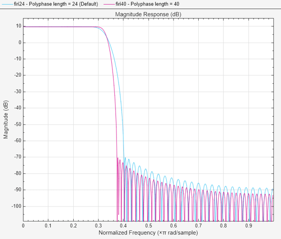 % Unspecified PolyphaseLength defaults to 24 firi24 = designMultirateFIR(InterpolationFactor=3,SystemObject=true); firi40 = designMultirateFIR(InterpolationFactor=3,... PolyphaseLength=40,... SystemObject=true);