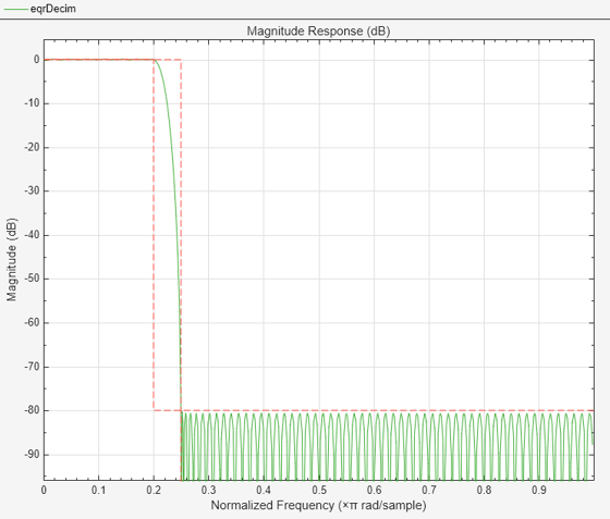 eqrDecim = designMultirateFIR(DecimationFactor=4,... OverlapTransition=false,... DesignMethod='equiripple', ... StopbandAttenuation=80,... PassbandRipple=0.1,... TransitionWidth=0.05,... SystemObject=true);