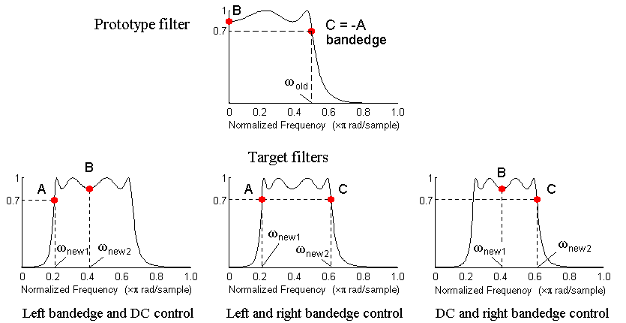 This first-order transformation performs an exact mapping of one selected feature of the prototype filter frequency response into two new locations in the target filter creating a passband between them. Both Nyquist and DC features can be moved with the rest of the frequency response.