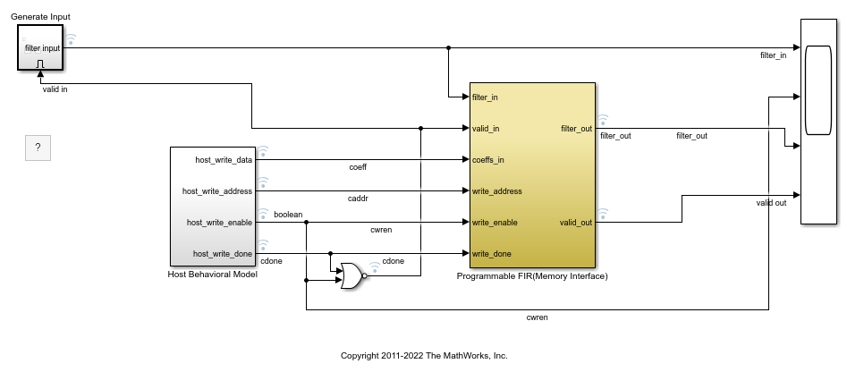 To view the input and output data and the signals of the coefficient interface, open the Scope and run the example model.
