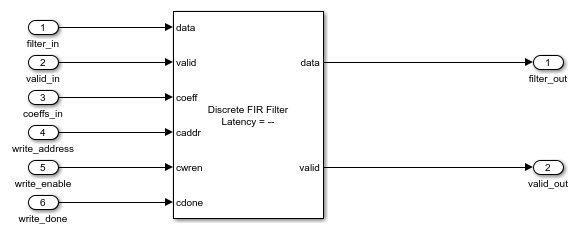 The Discrete FIR Filter block in this model is configured to use a fully parallel direct form systolic architecture. The block also supports using the memory-style programmable coefficients when the block uses the parallel transposed or serial architectures. The Coefficient prototype parameter is set to one of the coefficient vectors. This setting enables the block to optimize hardware resources based on the symmetry and position of zero-valued coefficients. When you specify a prototype, all input coefficient sets must match the prototype in symmetry and location of zero-valued coefficients. For more detail about how to use the prototype to optimize filter resources, see Optimize Programmable FIR Filter Resources (DSP HDL Toolbox).