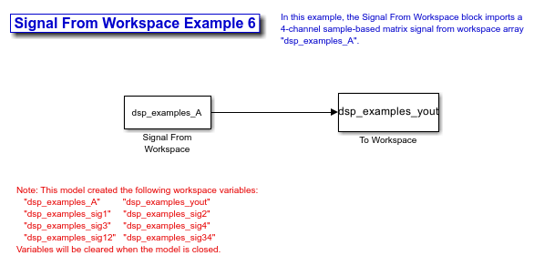 In this model, the Signal From Workspace block imports a four-channel matrix signal called dsp_examples_A. This signal is then exported to the MATLAB workspace using a To Workspace block.