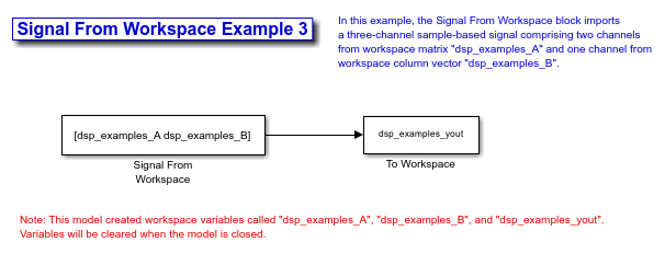 In the following example, the Signal From Workspace block imports a three-channel signal comprising of two channels from the workspace matrix dsp_examples_A, and one channel from the workspace column vector dsp_examples_B.