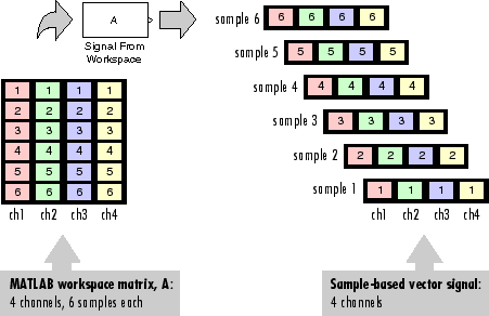 The Signal From Workspace block generates a vector signal for sample-based processing when the variable or expression in the Signal parameter is a matrix and the Samples per frame parameter is set to 1. Each column of the input matrix represents a different channel. Beginning with the first row of the matrix, the block outputs one row of the matrix at each sample time. Therefore, if the Signal parameter specifies an M-by-N matrix, the output of the Signal From Workspace block is M 1-by-N row vectors representing N channels.