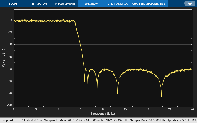 SA_IIR = spectrumAnalyzer(SampleRate=Fs,PlotAsTwoSidedSpectrum=false); tic while toc < 10 x = randn(256,1); y = LP_IIR(x); SA_IIR(y); end release(SA_IIR)