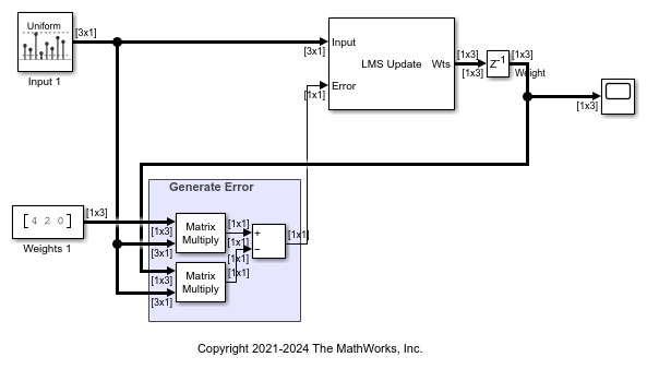 LMS Update | Random Source | Matrix Multiply (Simulink)