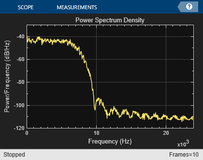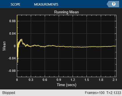 meanScope = timescope(SampleRate=Fs,... TimeSpanSource='property',... TimeSpan=numFrames*frameSize/Fs,... Title='Running Mean',... YLabel='Mean',... YLimits=[-0.1 .1],... Position=[43 308 420 330]); p2rmsScope = timescope(SampleRate=Fs,... TimeSpanSource='property',... TimeSpan=numFrames*frameSize/Fs,... Title='Running Peak-To-RMS',... YLabel='Peak-To-RMS',... YLimits=[0 5],... Position=[480 308 420 330]); minmaxScope = timescope(SampleRate=Fs,... TimeSpanSource='property', ... TimeSpan=numFrames*frameSize/Fs,... ShowGrid=true,... Title='Signal with Running Minimum and Maximum',... YLabel='Signal Amplitude',... YLimits=[-3 3],... Position=[43 730 422 330]); spectrumScope = dsp.ArrayPlot(SampleIncrement=.5 * Fs/(frameSize/2 + 1 ),... PlotType='Line',... Title='Power Spectrum Density',... XLabel='Frequency (Hz)',... YLabel='Power/Frequency (dB/Hz)',... YLimits=[-120 -30],... Position=[475 730 420 330]);