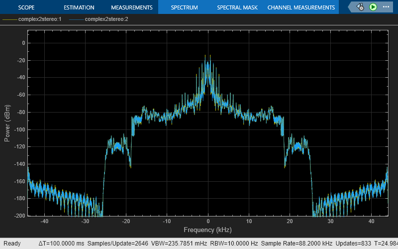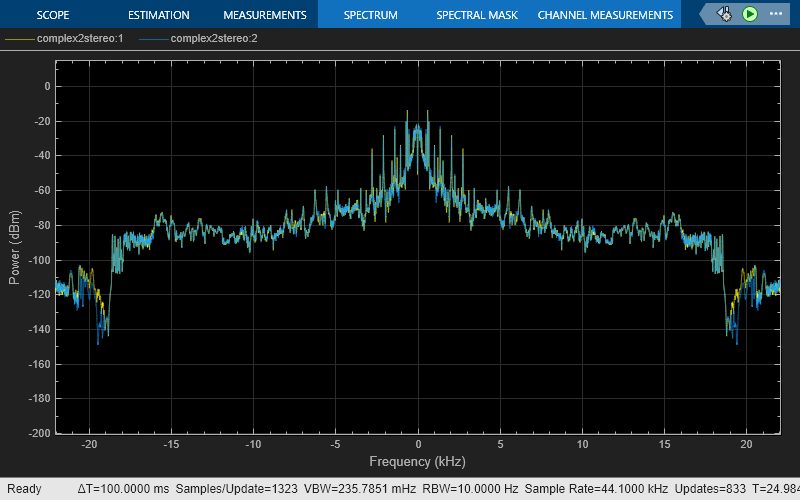 Each signal has a size of 1024-by-2 samples. The two columns (channels) represent the left channel and the right channel of the stereo signal. To store the stereo channels, the 'Convert to Complex and Mux' block converts each signal into complex signals. It then multiplexes the complex signals by a Matrix Concatenate block to form a 1024-by-4 matrix. The Channel Synthesizer block synthesizes these four signals into a single broadband signal of size 4096-by-1. The Channelizer block that follows splits this broadband signal back into narrow subbands. The Channelizer block has 4 outputs, each output is a 1024-by-1 vector representing a narrow band.