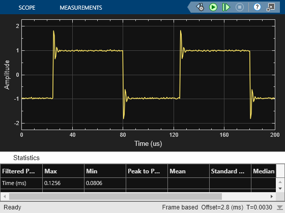 The edges of the pulses are fairly steep, with a slew rate of about 4 V/us. The example uses an underdampened filter to achieve this rate. Changing to an overdamped filter will decrease the rate at which the edge of each pulse can transition between pulse levels. The output of an underdampened filter exhibits significant ringing immediately after changing between low and high states. To quantify this ringing behavior, you can use the measurements in the Overshoots / Undershoots list.