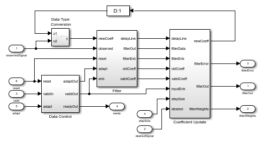 , returned as a scalar for the HDLFullySerialLMSModel.slxmodel and a vector of the same size as filter length for theHDLDelayLMSFilterModel.slxmodel.ready — Ready signal, returned as a Boolean scalar. This port is applicable for the