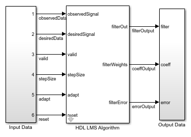 This section explains the port and parameter descriptions for the HDLFullySerialLMSModel.slx and HDLDelayLMSFilterModel.slx models. The input observedSignal and desiredSignal signals must be scalars and of the same data type. To support HDL code generation, inputs must be scalar fixed-point data types.