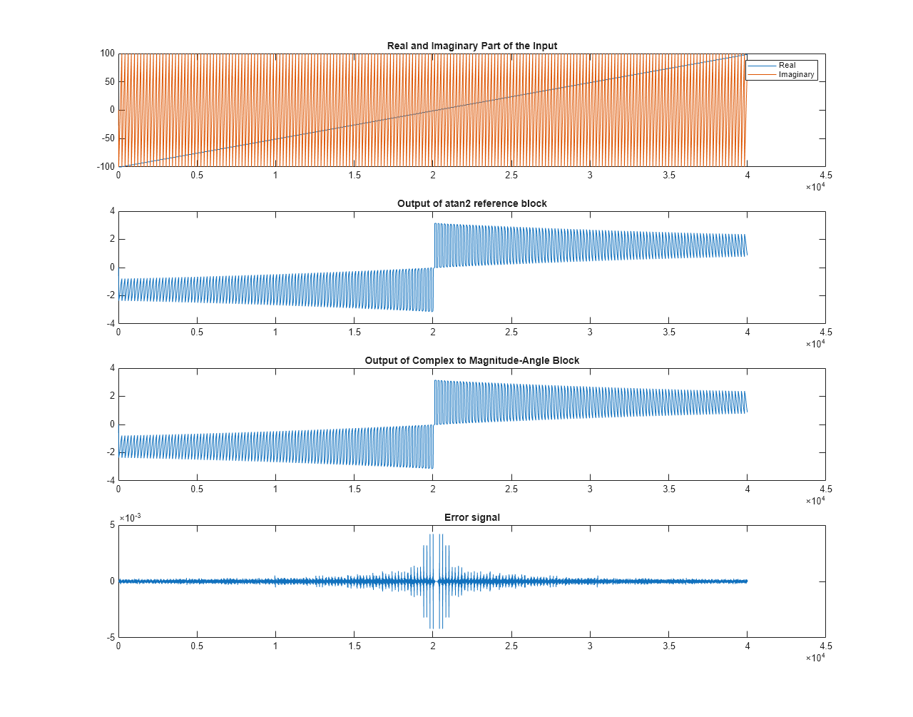 figure('units','normalized','outerposition',[0 0 1 1]) subplot(4,1,1) plot(simout1(:,1)) hold on; plot(simout1(:,2)) hold off; legend('Real','Imaginary') title('Real and Imaginary Part of the Input') subplot(4,1,2) plot(simout2(:,1)) title('Output of atan2 reference block') subplot(4,1,3) plot(simout2(:,2)) title('Output of Complex to Magnitude-Angle Block') subplot(4,1,4) plot(simout3) title('Error signal')