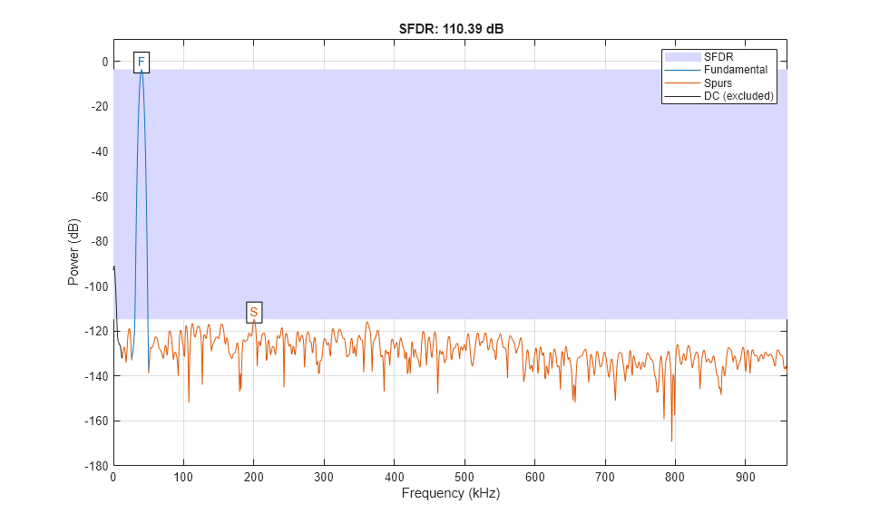 % Initialize random seed before executing any simulations. rng(0); % Generate a 40 kHz test tone, modulated onto the carrier. ddcIn = DDCTestUtils.GenerateTestTone(40e3,Fc); % Demodulate the test signal with the floating-point DDC. ddcOut = DDCTestUtils.DownConvert(ddcIn,FsIn,Fc,ddcFilterChain); release(ddcFilterChain); % Demodulate the test signal by running the Simulink model. out = sim(modelName); % Measure the SFDR of the NCO, floating-point DDC outputs, and fixed-point % DDC outputs. results.sfdrNCO = sfdr(real(out.ncoOut),FsIn); results.sfdrFloatDDC = sfdr(real(ddcOut),FsOut); results.sfdrFixedDDC = sfdr(real(out.ddcFixedOut),FsOut); disp('SFDR Measurements'); disp([' Floating-point DDC SFDR: ',num2str(results.sfdrFloatDDC) ' dB']); disp([' Fixed-point NCO SFDR: ',num2str(results.sfdrNCO) ' dB']); disp([' Optimized fixed-point DDC SFDR: ',num2str(results.sfdrFixedDDC) ' dB']); fprintf(newline); % Plot the SFDR of the NCO and fixed-point DDC outputs. ddcPlots.ncoOutSDFR = figure; sfdr(real(out.ncoOut),FsIn); ddcPlots.OptddcOutSFDR = figure; sfdr(real(out.ddcFixedOut),FsOut);