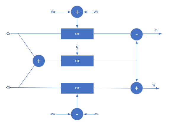 When both the data and coefficients are complex, the block implements three filters in parallel. The diagram shows the filter implementation for complex input data X = Xr+i×Xi and complex coefficients W = Wr+i×Wi.