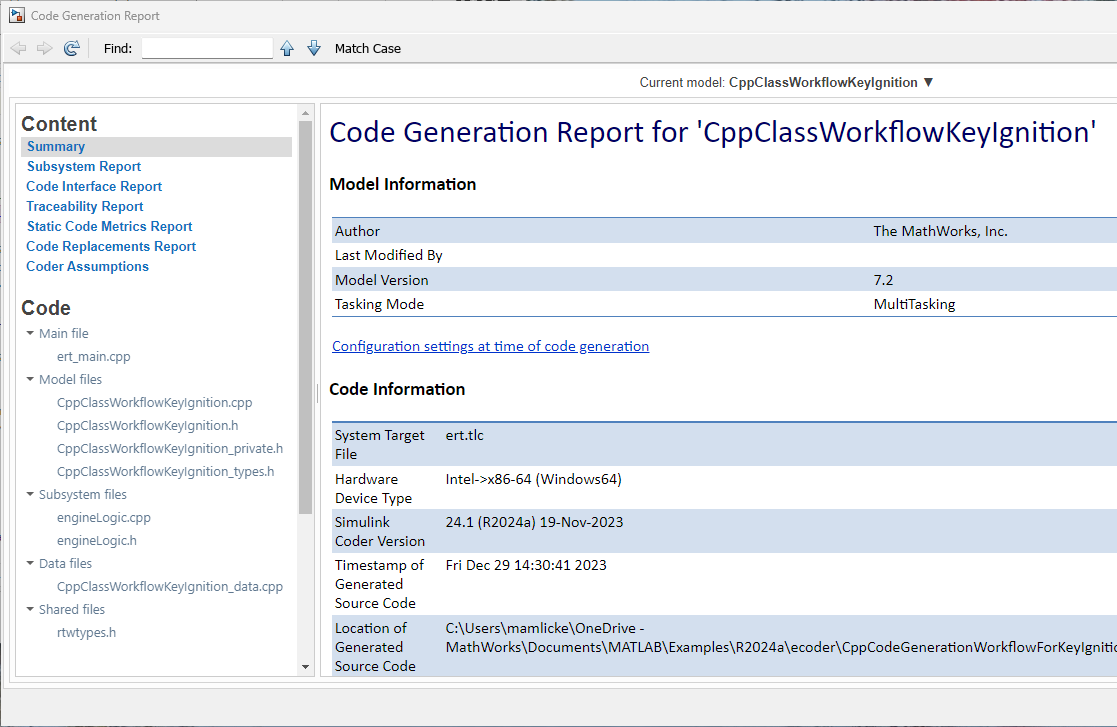 The CppClassWorkflowKeyIgnition_ert_rtw folder contains the model-specific files of your generated code, including the two primary files CppClassWorkflowKeyIgnition.cpp and CppClassWorkflowKeyIgnition.h.