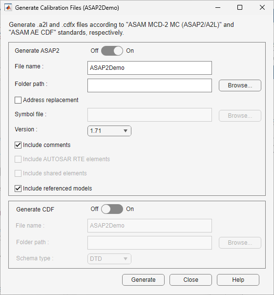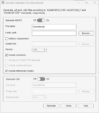 Use the Generate Calibration Files tool to customize and generate the calibration files for a Simulink® model. You can generate an ASAP2 file, a CDF file, or both. By default, the tool generates the latest supported version of the A2L file according to ASAM MCD-2 MC standards. You can choose to generate a different version. You can customize the options for calibration files, such as the version for the A2L file and the schema type, for the CDF file. The tool remembers the last used settings, such as the version of the ASAP2 file, the option to exclude comments, the option to exclude referenced model elements, and the option to enable the ASAP2 file and CDF file generation. Simulink saves these settings in your MATLAB® settings. The saved settings override the default settings.