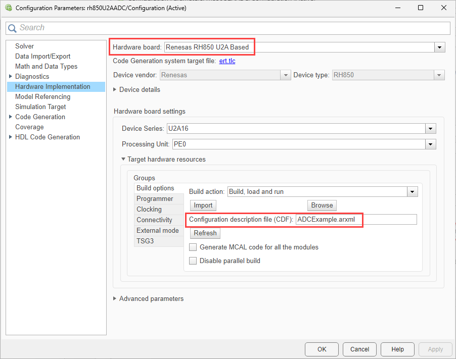 • ADCExample.arxml is added as the configuration description file in Build options. To verify click Modeling > Model Settings to open the Configuration Parameters dialog box. Navigate to Hardware Implementation > Target hardware resources > Build options.