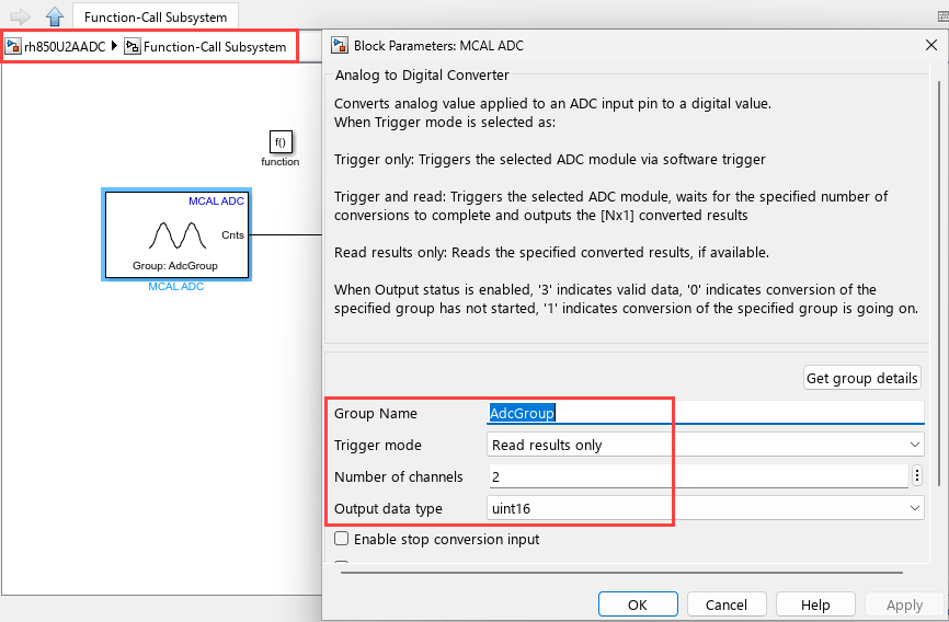 Inside the triggered subsystem, another MCAL ADC block reads the results.