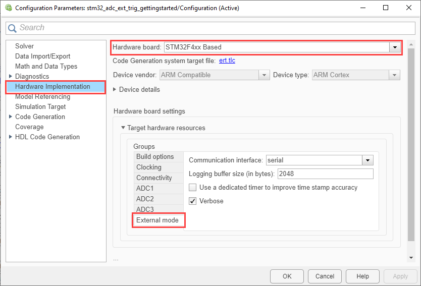 The hardware board has USART pins connected to ST-LINK. To run the model in External mode, ensure to configure the GPIO settings for USART. For more information on USART pins connected to the ST-LINK, refer to the respective board's schematic diagram.