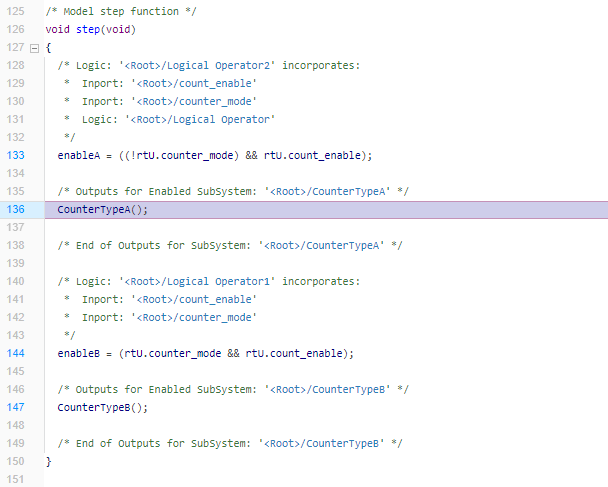 CounterTypeA, which is called bystep.On the toolstrip, in the Results section, click Highlight Code. The code generation report displays the function call.