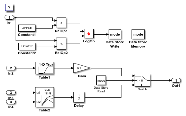 The model contains four inports. In1 is configured to use the storage class ImportFromFile. For this example, you configure the other inports to read data from external code by default. The model also contains state data for the Delay block that you configure to be accessible by external code. When you apply the storage classes ImportFromHeader and ExportToPrivateHeader to the model elements, the generated code conforms to this architecture.