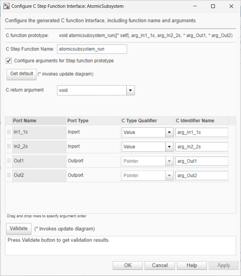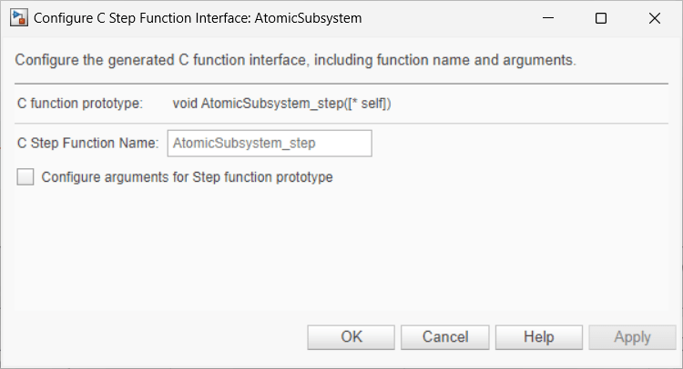 1. Open the Configure C Step Function Interface dialog box for the model AtomicSubsystem.
