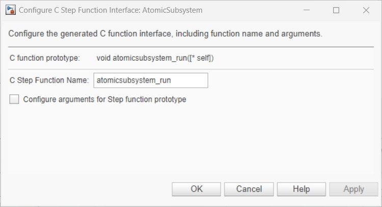 1. In the Configure C Step Function Interface dialog box, set C Step Function Name to atomicsubsystem_run. The function preview is updated to reflect the new function name.