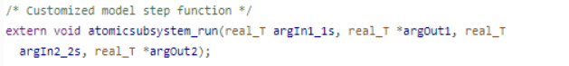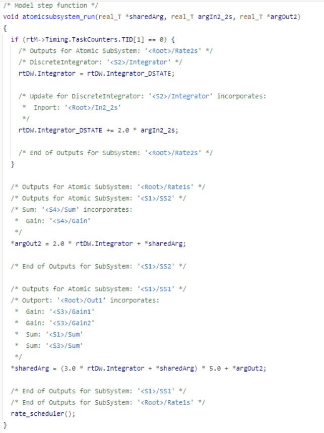 6. Generate and view the code. In the Code view, search for the atomicsubsystem_run function and check the function interface. For this example, the shared argument appears in read code for the Inport block and write code for the Outport block.