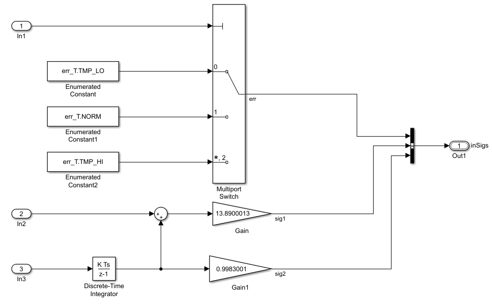 When you finish, the model stores output signal data (such as the signals err and sig1) in the fields of a structure variable named inSigs.