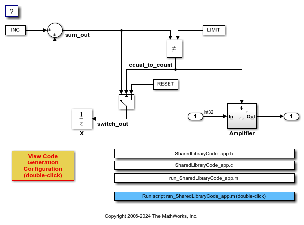 To build the model and run the application that uses the generated shared library, in the model, double-click the blue button.