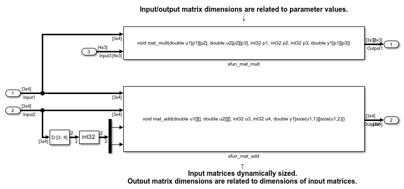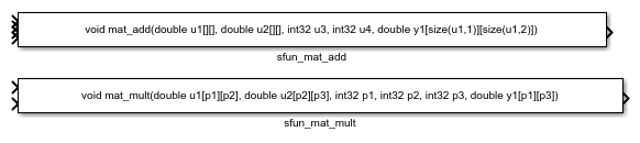 After you compile the S-functions and use them in simulation, you can call the function legacy_code() again with the first input set to sfcn_tlc_generate to generate TLC block files. Block files specify how the generated code for a model calls the legacy code. If you do not generate TLC block files and you try to generate code for a model that includes the S-functions, code generation fails. The TLC block files for the S-functions are sfun_mat_add.tlc and sfun_mat_mult.tlc.