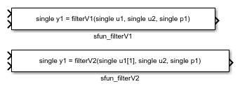 defs = []; % sfun_filterV1 def = legacy_code('initialize'); def.SFunctionName = 'sfun_filterV1'; def.OutputFcnSpec = 'single y1 = filterV1(single u1, single u2, single p1)'; def.HeaderFiles = {'myfilter.h'}; def.SourceFiles = {'filterV1.c'}; def.IncPaths = {'Lct_src'}; def.SrcPaths = {'Lct_src'}; defs = [defs; def]; % sfun_filterV2 def = legacy_code('initialize'); def.SFunctionName = 'sfun_filterV2'; def.OutputFcnSpec = 'single y1 = filterV2(single u1[1], single u2, single p1)'; def.HeaderFiles = {'myfilter.h'}; def.SourceFiles = {'filterV2.c'}; def.IncPaths = {'Lct_src'}; def.SrcPaths = {'Lct_src'}; defs = [defs; def];