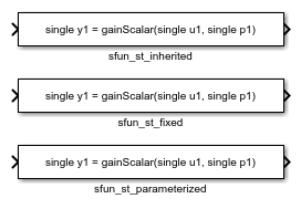 To generate C-MEX S-functions according to the description provided by the input argument defs, call the function legacy_code() again with the first input set to sfcn_cmex_generate. The S-functions call the legacy functions during simulation. The source code for the S-functions is in the files sfun_st_inherited.c, sfun_st_fixed.c and sfun_st_parameterized.c.