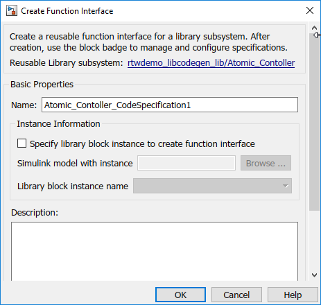 AutoorUse function name.In the library, right-click the Subsystem and select C/C++ Function Interfaces > Create Function Interface. In the Create Function Interface dialog box, for the Name parameter, specify a name that describes the context.
