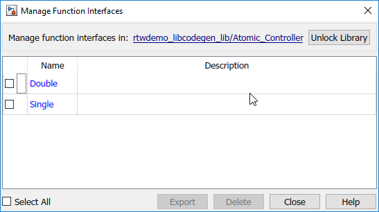 In the library, right-click the reusable library subsystem and select C/C++ Function Interfaces > Create Function Interface. Specify a function interface Name.
