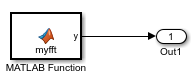 3. In the MATLAB Function block, add code that calls a MATLAB FFT function. For example, add the function myfft that calls the MATLAB function fft.