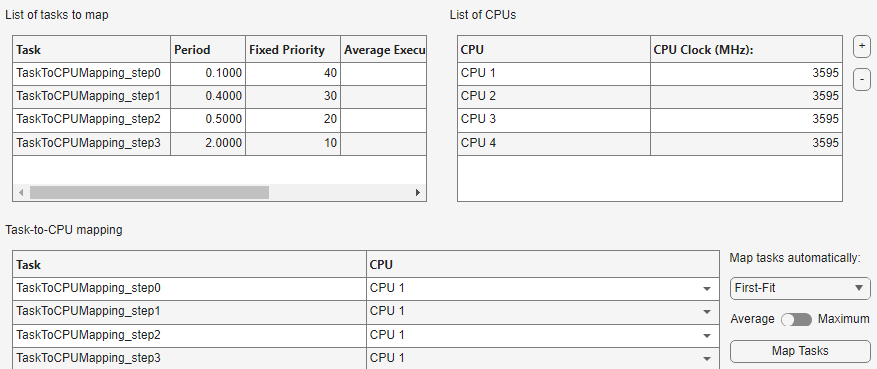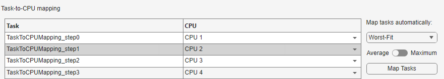 • Use an algorithm from the Map tasks automatically list. For the algorithm, you must specify the use of average (default) or maximum task execution times. For a list of algorithms, see Select Algorithm for Task-to-CPU Mapping.